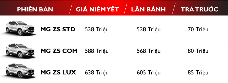 Xe MG ZS giá thế nào? Giá MG ZS 2023 lăn bánh mới nhất là vấn đề được rất nhiều người quan tâm. Hiện tại MG ZS với 3 phiên bản MG ZS STD (phiên bản tiêu chuẩn), MG ZS COM (Phiên bản giữa), MG ZS Luxury (Phiên bản cao cấp) có các mức giá lăn bánh tạm tính như sau: